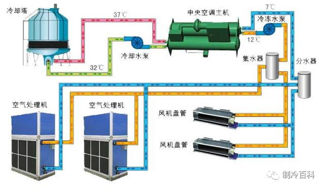 2、定、變頻一拖多:其中有1~2臺(tái)變頻壓縮機(jī)或另加1臺(tái)定頻壓縮機(jī),電路上有射頻干擾,對(duì)電腦有影響。檢修孔新風(fēng)引入吊頂與冷凝水與多聯(lián)機(jī)相同;對(duì)氟管的分支器要求設(shè)計(jì)合理;對(duì)上,下層共用1臺(tái)機(jī)器,管路要求更高;較易在全開啟時(shí)出現(xiàn)末端內(nèi)機(jī)效果太差的情況。三、冷熱水機(jī)定頻冷熱水機(jī)或變頻冷熱水機(jī):大型中央空調(diào)的縮小,冷凝器由水冷變成風(fēng)冷;用水泵將冷熱水送至風(fēng)機(jī)盤管。引入新風(fēng)、檢修孔、吊頂冷凝水排放、噪聲指標(biāo)與多聯(lián)機(jī)相同。但又增加了冷熱水管;由于溫度差很大,密封問(wèn)題突出,出現(xiàn)漏水對(duì)裝潢的破壞較大。另外大型中央空調(diào)蒸發(fā)器都定時(shí)清理和酸洗;家用冷熱水機(jī)對(duì)此還無(wú)良策,長(zhǎng)期使用,冷熱交換器的效率將大打折扣。如能與中央水處理系統(tǒng)相結(jié)合,可克服上述難點(diǎn)。單獨(dú)房間使用空調(diào),其它房間風(fēng)機(jī)盤管有冷熱水管流過(guò),也會(huì)產(chǎn)生能耗;現(xiàn)較流行采用電磁水閥來(lái)關(guān)閉水路;除去造價(jià)上的因素外;還會(huì)使局部水流速過(guò)高,產(chǎn)生噪聲的問(wèn)題。中央空調(diào)系統(tǒng)——工作原理冷(熱)水機(jī)組的基本工作過(guò)程是:室外的制冷(熱)機(jī)組對(duì)冷(熱)媒水進(jìn)行制冷降溫(或加熱升溫),然后由水泵將降溫后的冷媒(熱)水輸送到安裝在室內(nèi)的風(fēng)機(jī)盤管機(jī)組中,由風(fēng)機(jī)盤管機(jī)組采取就地回風(fēng)的方式與室內(nèi)空氣進(jìn)行熱交換實(shí)現(xiàn)對(duì)室內(nèi)空氣處理的目的。 風(fēng)管(道)式機(jī)組的基本工作過(guò)程:供冷時(shí),室外的制冷機(jī)組吸收來(lái)自室內(nèi)機(jī)組的制冷劑蒸氣經(jīng)壓縮、冷凝后向各室內(nèi)機(jī)組輸送液體制冷劑。供熱時(shí),室外的制冷機(jī)組吸收來(lái)自冷凝器的制冷劑蒸氣經(jīng)壓縮后向各室內(nèi)機(jī)組輸送汽體制冷劑,室內(nèi)機(jī)組通過(guò)布置在天花板上的回風(fēng)口將空氣吸入,進(jìn)行熱交換后送入安裝在室內(nèi)各房間天花板中的風(fēng)管(道)內(nèi),并通過(guò)出風(fēng)口上的散流器向室內(nèi)各房間輸送空氣。在風(fēng)管(道)上設(shè)計(jì)有新風(fēng)門和排風(fēng)門,可以按一定比例置換空氣,以保證室內(nèi)空氣的質(zhì)量。 中央空調(diào)系統(tǒng)——商用系統(tǒng)單冷式:將室內(nèi)熱濕空氣吸入,經(jīng)蒸發(fā)器將其中的水蒸氣冷凝,然后將干燥、涼爽的空氣送入室內(nèi),起到降溫、降濕的作用。冷熱式:既能降溫、降濕,又可制熱、取暖。制熱方式可分為熱泵式和電熱式。熱泵式空調(diào)取暖時(shí),室外空氣溫度在5℃以上才能正常工作。 移動(dòng)式:它與窗式空調(diào)器的區(qū)別是采用水冷方式,冷凝水通過(guò)軟管排出,可以在室內(nèi)隨意移動(dòng),不用安裝。分體式:它由室內(nèi)機(jī)箱和室外機(jī)箱組成,室外機(jī)箱組合了制冷系統(tǒng)中的壓縮機(jī)、冷凝器和軸流風(fēng)機(jī)等。 變頻空調(diào):是由電腦控制的變頻器和變頻壓縮機(jī)組成的,它運(yùn)用變頻控制技術(shù),使空調(diào)根據(jù)環(huán)境溫度自動(dòng)選擇制冷、制熱和除濕運(yùn)轉(zhuǎn)方式,使居室在短時(shí)間內(nèi)迅速達(dá)到所需要的溫度,并在低轉(zhuǎn)速低能耗狀態(tài)下以較小的溫差波動(dòng),實(shí)現(xiàn)快速、節(jié)能和舒適的控溫效果。水冷式:由室內(nèi)盤管,室外機(jī)可以是水冷螺桿或冷卻搭(這種也屬于單冷式),機(jī)組里面的東東就不說(shuō)了,四大部件你應(yīng)該知道的吧。 風(fēng)冷式:室內(nèi)盤管,室外機(jī)是風(fēng)冷螺桿或模塊機(jī)組。 中央空調(diào)系統(tǒng)是由一系列驅(qū)動(dòng)流體流動(dòng)的運(yùn)動(dòng)設(shè)備(如水泵、風(fēng)機(jī)及壓縮機(jī))、各種型式的熱交換器(如風(fēng)機(jī)盤管、蒸發(fā)器、冷凝器及中間熱交換器等)及連接各種裝置的管道(如風(fēng)管、水管及冷媒管)和閥件所組成。系統(tǒng)一般可分下列五個(gè)循環(huán) :1、室內(nèi)空氣循環(huán);2、冷水循環(huán); 3、冷媒循環(huán); 4、冷卻水循環(huán); 5、室外空氣循環(huán)。中央空調(diào)系統(tǒng)——主要組成設(shè)備一、按負(fù)擔(dān)室內(nèi)熱濕負(fù)荷所用的介質(zhì)可分為:1、全空氣系統(tǒng);2、全水系統(tǒng);3、空氣-水系統(tǒng);4、冷劑系統(tǒng)。二、按空氣處理設(shè)備的集中程度可分為:1、集中式;2、半集中式。三、按被處理空氣的來(lái)源可分為:1、封閉式;2、直流式;3、混合式(一次回風(fēng) 二次回風(fēng))。主要組成設(shè)備有空調(diào)主機(jī)(冷熱源) 風(fēng)柜 風(fēng)機(jī)盤管等等。從本質(zhì)上講,均由空氣處理設(shè)備,空氣輸送設(shè)備,空氣分布裝置三大部分組成。此外還有制冷系統(tǒng),供熱系統(tǒng)及自動(dòng)調(diào)節(jié)系統(tǒng)。空氣熱濕處理設(shè)備空氣熱濕處理設(shè)備主要是對(duì)空氣進(jìn)行加熱、加濕、冷卻、除濕等處理。1)噴水室。在民用建筑中不再采用,但在以調(diào)節(jié)濕度為主要目的的紡織廠和卷煙廠空調(diào)中仍大量使用