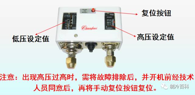 控制高低壓壓力,當(dāng)排氣壓力過高或吸氣壓力過低時(shí),控制器立即動(dòng)作切斷壓控控制線路,使壓縮機(jī)停車。