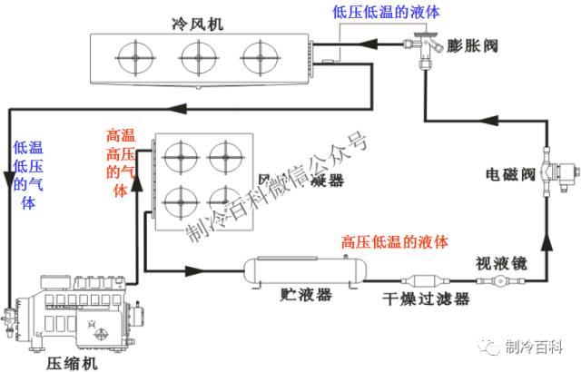 4、經(jīng)過熱力膨脹閥的節(jié)流降壓變成低壓低溫的制冷劑液體后流入蒸發(fā)器(冷風(fēng)機(jī)或盤管);