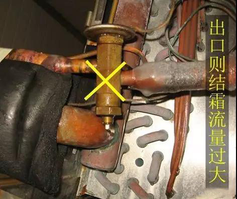 熱力膨脹閥開啟過大:制冷劑通過的流量就多,即熱力膨脹閥向蒸發器的供液量大于蒸發器負荷,使液體制冷劑蒸發過剩,會造成部分液體制冷劑來不及在蒸發器內蒸發,同氣態制冷劑一起被吸入壓縮機,引起壓縮機的濕沖程(液擊),使壓縮機不能正常工作,造成一系列工況惡劣,甚至沖缸損壞壓縮機的事故。同時,熱力膨脹閥開啟過大也會造成制冷量下降,壓縮機功耗增加,增加了耗電量。