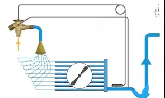 供液量不足的盤管內制冷劑很快蒸發,在出口產生較大過熱度,換熱面積沒有得到有效利用。供液量過多的盤管內出口過熱度很小,甚至帶有未蒸發的液體,換熱面積不足, 同時,蒸發器出口總管由于制冷劑的混合或再次蒸發,過熱度低于理論值,過熱度降低,對節流裝置產生的信號是供液量過多,節流裝置自行調節,以減少供液量;供液量減少,質量流量降低,分液效果更差,形成惡性循環;最終導致蒸發器有效面積急劇減少,制冷量下降,整個制冷系統運行性能惡化......