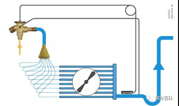 供液量不足的盤管內制冷劑很快蒸發,在出口產生較大過熱度,換熱面積沒有得到有效利用。供液量過多的盤管內出口過熱度很小,甚至帶有未蒸發的液體,(本文來源:制冷百科公眾號)換熱面積不足, 同時,蒸發器出口總管由于制冷劑的混合或再次蒸發,過熱度低于理論值,過熱度降低,對節流裝置產生的信號是供液量過多,節流裝置自行調節,以減少供液量;供液量減少,質量流量降低,分液效果更差,形成惡性循環;最終導致蒸發器有效面積急劇減少,制冷量下降,整個制冷系統運行性能惡化......